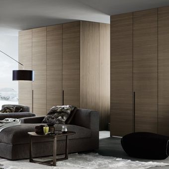 Броско выглядит комбинирование нескольких материалов, контрастных текстур и цветов: дверцы в светлой коже с горизонтальной полосой из термообработанного дуба; черный глянцевый лак с вставками из матового белого стекла. Ручки могут быть максимально спрятаны или, напротив, выполнять декоративную функцию. Одни и те же модели могут на выбор изготавливаться с распашными, раздвижными, компланарными дверцами.