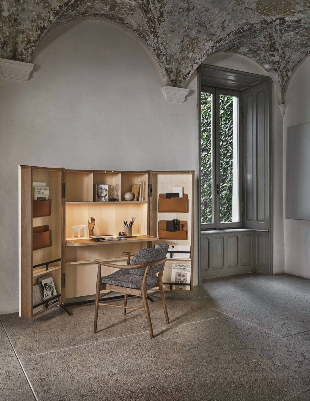 - Стол Savio, ставший частью коллекции Porada Twentytwo, которая была представлена на миланской выставке в 2022 году. Прообразом изделия стал классический секретер: за распашными фасадами из ореха или клена прячется удобный письменный стол с откидной столешницей и несколько полок. Дверцы оснащены отсеками для хранения и кожаными карманами для документов или нужных мелочей, а стол — розеткой для электронных девайсов и портом USB.